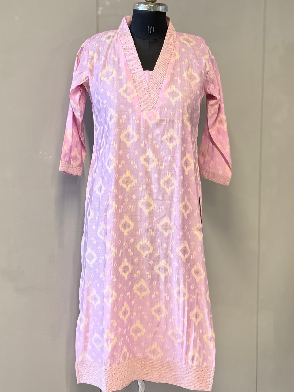 Elevate your everyday ethnic style with this pastel pink ikat print kurti for women, designed...